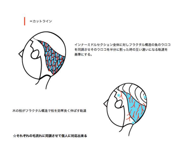 急所を守るために太く硬い毛が生えるインナーミドル。その密度を補正し剪定するのがスプリットカット。ウロコの重なりを想定し、それを半分に割るイメージ で根元から互い違いに間引き、髪の行き場を作り軽さと動きを出す。このとき毛 流れと同調させること。※フィボナッチ数のフラクタル(自己相似性)な互い違い