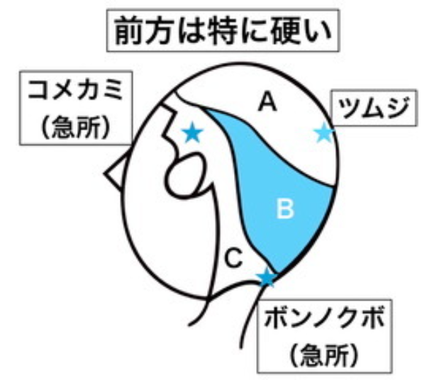 アンダーにある[こめかみ] [ぼんのくぼ] という 急所に被さる部分。そのため密度が高く太めの 髪になるので毛根はエネルギーを使いすぎる。重心が下がりやすく広がりやすい部位。