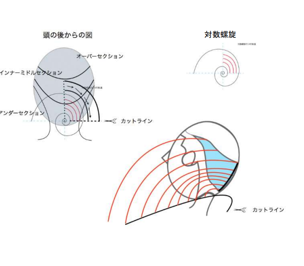 オーバーセクションのつむじの毛流れ(対数螺 旋)の軌道を使い、効率のよい重なりをつくる 。ハチ上から螺旋上でスライスを取り、頭頂部 にいくほど絞り上げる角度でパネルを引く。根 元のラインとカットラインは同調をしている。※対数螺旋が定規の役割をする。