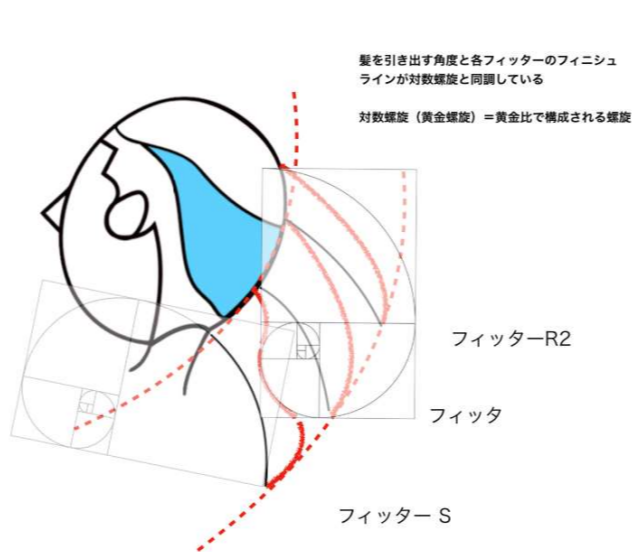 - 黄金比になったトップ、ミドル、アンダーを更に黄金比で繋ぐフィッターカット(対数螺旋の軌道のS状とR状を使う)