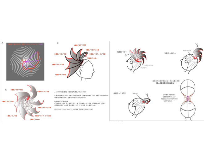 - トップの重なりには対数螺旋(黄金比の渦)を使ったトルネードカット